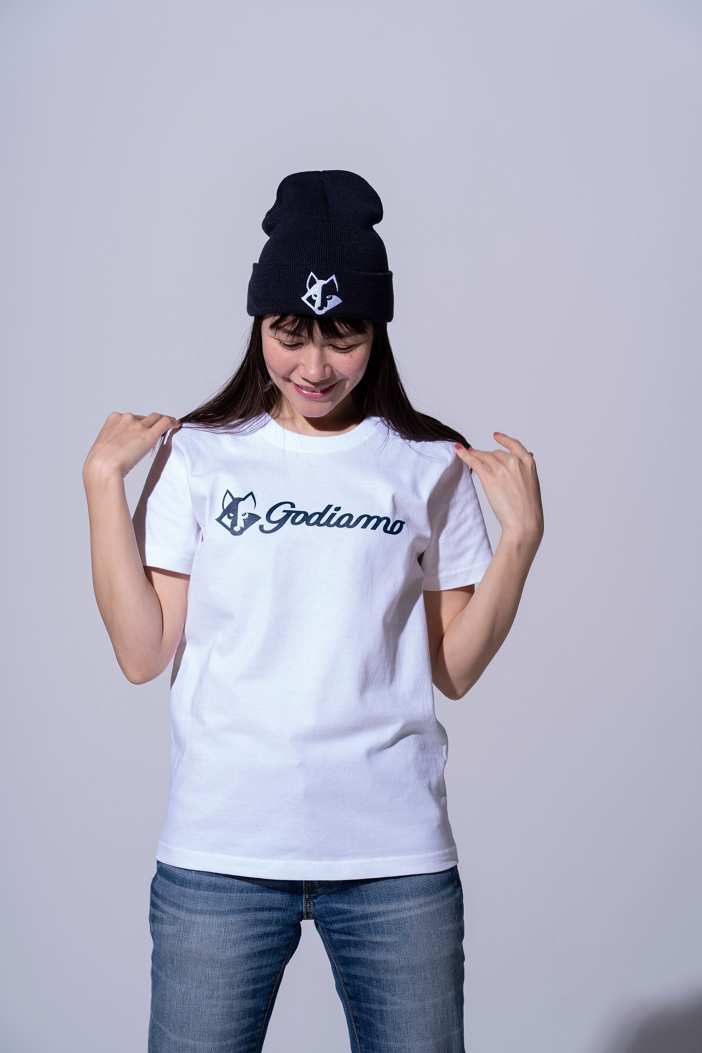 胸にGodiamoマーク、ロゴ(ネイビー)をプリント。